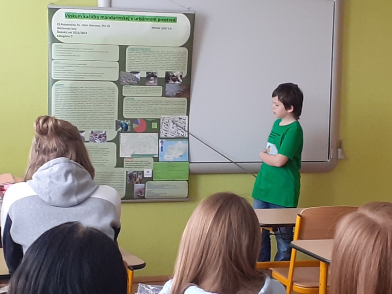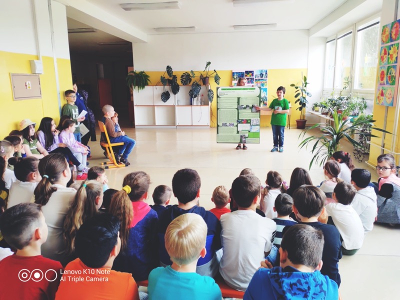 Najstarší žiaci si pozreli zaujímavé interaktívne video, v ktorom sa oboznámili s najvážnejšími problémami na našej planéte. Uvedomili si, že naša Zem potrebuje naozaj pomoc, nakoľko jej ľudia svojím správaním veľmi ubližujú. Potom si vypočuli prezentáciu nášho žiaka Michala Ujčíka, ktorý im porozprával o svojom výskume, ktorého cieľom bolo pozorovať invázny druh – kačičku mandarínsku a jej interakcie s pôvodnými druhmi vtáctva, ktoré žijú v blízkosti Hostianskeho potoka. Starší žiaci sa tiež pričinili o vyčistenie areálu školy a úpravu átria.
