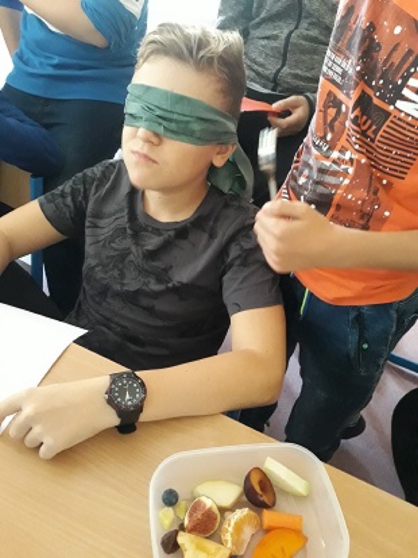 Pripravili sme preto pre žiakov aktivity. Na hodinách biológie sme si v rámci učiva o ovocí a zelenine urobili so šiestakmi v triedach malú výstavku plodov. Objavila sa tu rôzna zelenina a ovocie, ktoré dopestovali rodičia, starí rodičia v záhradkách, za čo im ďakujeme. Na ovocí si žiaci dokonca hneď na hodine (trochu netradične ) aj pochutili. V prezentácii sme si ukázali a vysvetlili zásady zdravého stravovania, dôležitosť pestrej stravy, význam vitamínov, minerálov a množstvo ďalších zaujímavých informácií. Žiaci si potom vybrali svoje obľúbené ovocie, alebo zeleninu a pripravili tvarovo naozaj zaujímavý projekt. Svojim spolužiakom porozprávali napr. o jablku, maline, jahode, citróne, hrachu, hrozne …., ale dokonca aj o ananáse a dračom ovocí (pitahaya). Žiaci sa zabavili a zasúťažili si na ovocno – zeleninovom puzzle. Víťazná skupina (dievčatá zo 6.c) poskladala všetky druhy ovocia a zeleniny a bude na ďalšej hodine biológie ušetrená od skúšania. No, kto by nesúťažil s takou výhrou?! Ešte zábavnejšie bolo ale hádanie ovocia a zeleniny so zaviazanými očami iba podľa chutí. Dve rovnako pripravené misky s kúskami ovocia a zeleniny čakali na „ochutnávačov“ v 6.a. triede. Pri jablku, slivke, mandarínke, hruške, hurmikaki … sa ešte deti usmievali, ale cibuľa, cesnak, citrón, zázvor ich teda poriadne vyštípali. Žiaci uhádali vlastne takmer úplne všetko ovocie a zeleninu.