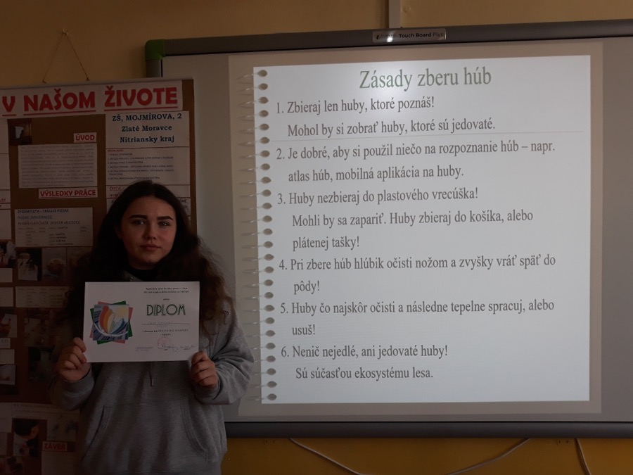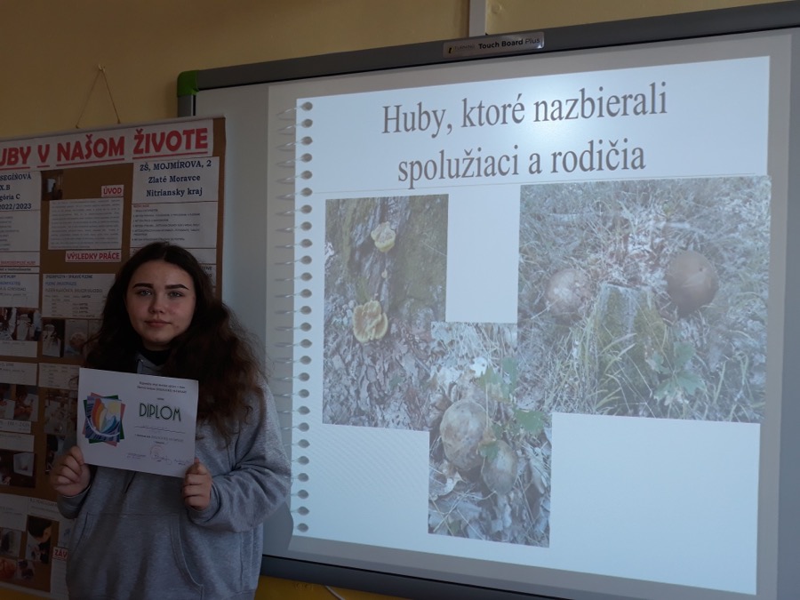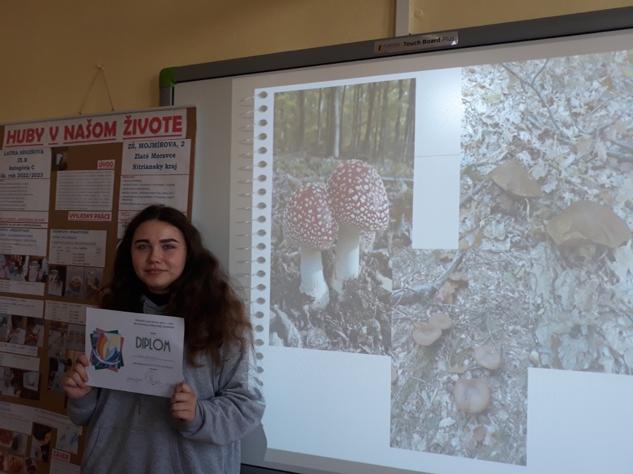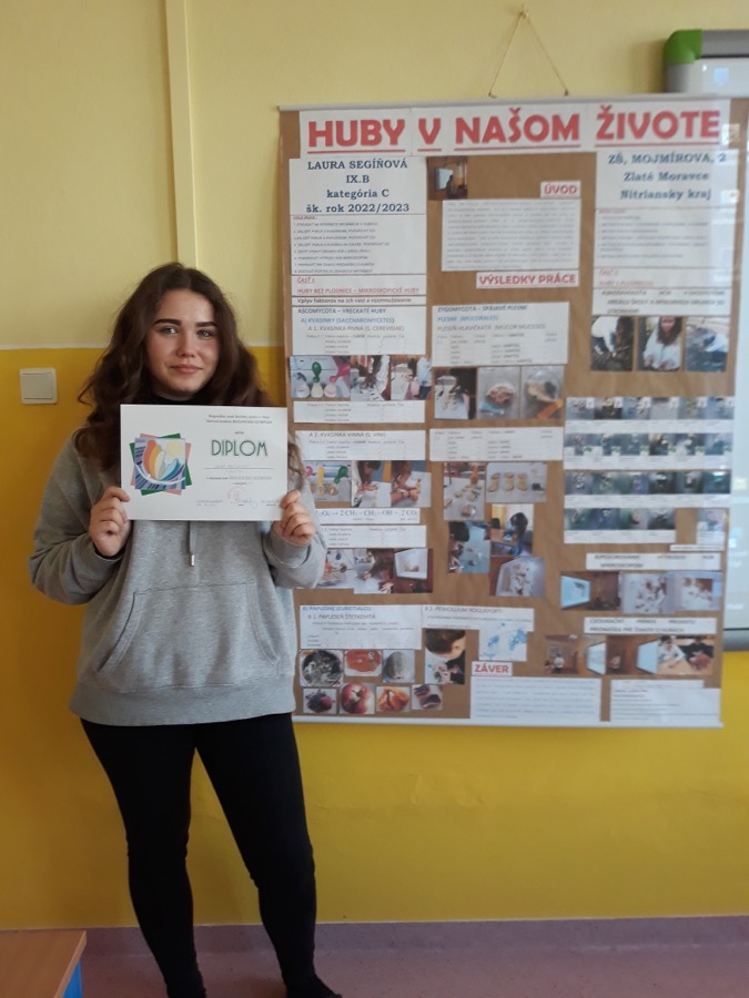 Fascinujúci svet húb zaujal aj našu deviatačku Lauru Segíňovú a preto ako tému biologickej olympiády si vybrala práve huby. So svojim posterom sa zapojila do projektovej časti biologickej olympiády v kategórii C, kde získala v okresnom kole 1. miesto. Laura svoj projekt rozdelila na 2 časti, venovala sa hubám mikroskopickým a aj hubám s plodnicou. V školskej biochemickej učebni uskutočnila pokusy s kvasinkami, plesňami, paplesňami. Laura overovala teóriu z internetu, pracovala s dostupným materiálom, ale vzorku kvasinky vinnej nám dokonca poskytli vo Vinárskych závodoch v Topoľčiankach. V našom školskom areáli zisťovala biodiverzitu húb a ich symbiózu so stromami – mykorhízu. Pre piatakov pripravila prednášku, na ktorej žiakom zdôraznila najmä zásady zberu húb. Piataci vypĺňali dotazník o hubách, prezreli si huby v prezentácii, ale aj hubu prinesenú ich spolužiačkou. Laure srdečne blahoželáme k úspechu na olympiáde a ďakujeme za krásnu reprezentáciu našej školy. Verím, že hubám sa bude venovať aj naďalej, ako povedala: „minimálne pri hubárčení“.