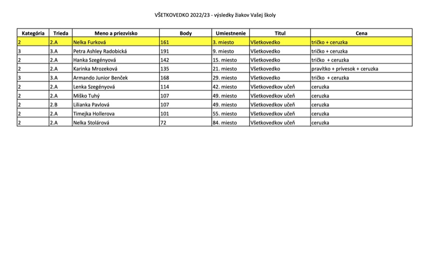 Ich výsledky si môžete pozrieť v priloženom dokumente. Ďakujeme všetkým za reprezentáciu školy vo vedomostnej súťaži.