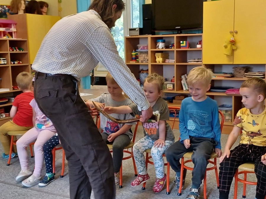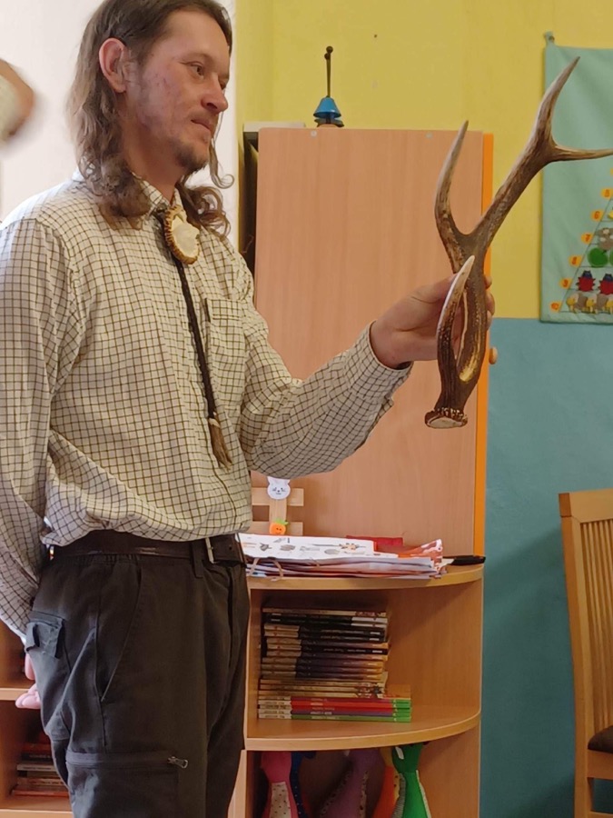 Prostredníctvom zážitkového učenia priblížili dvaja majstri deťom život zvierat v lese, ale hlavne priblížili deťom život dravcov. Deti mali možnosť dotýkať sa kožucha líšky či jazveca. Pozreli a ohmatali kmeň stromu , ktorý BOBOR riečny ohrýzol, dotlki sa rôznych parohov – jeleňa, daniela a srnčeka.