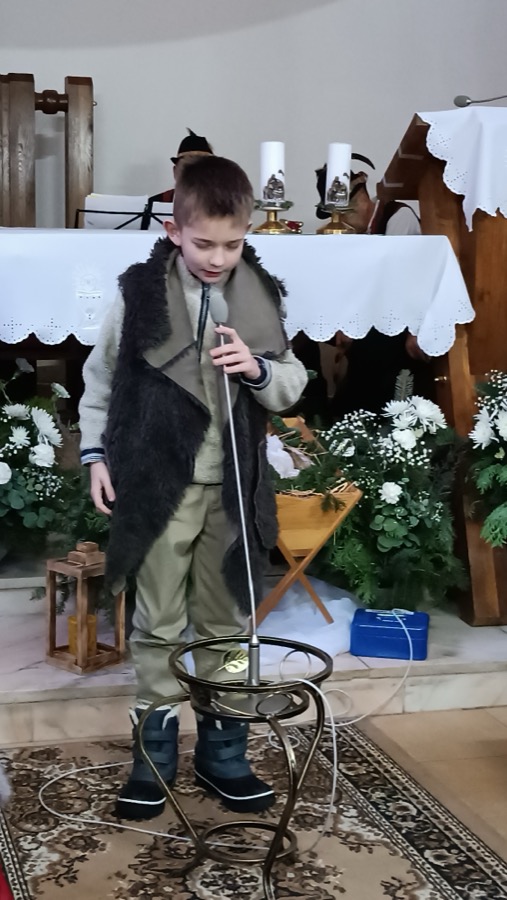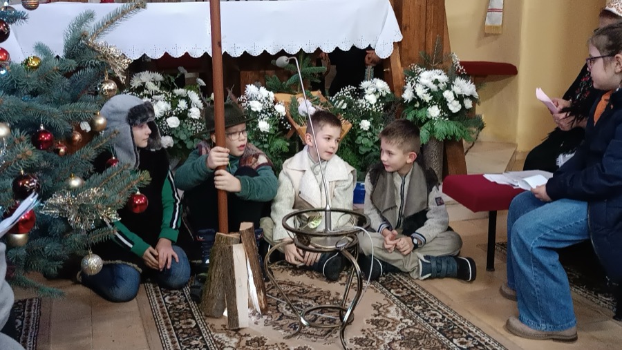 Pri osvetlenom vianočnom stromčeku ležal na slame v jasličkách malý Ježiško. Okolo neho sedeli deti a pastieri. Hovorili: „Éj, bračekovia, už sme dopásli. Tráva je suchá a noci sú studené. Musíme zahnať ovečky do košiara, aby neprišli vlci. Máte tam slamu a seno?“ „Áno, všetko je nachystané,“ odpovedali. Vtom sa ozval Anjel z neba: „Pastieri, pastieri, vstante a ponáhľajte sa do mesta Betlehéma.“