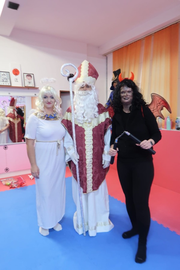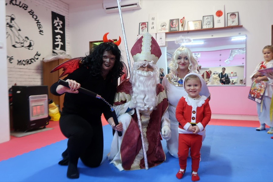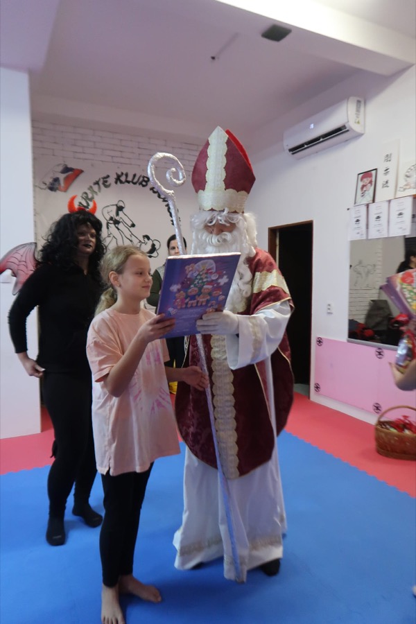 V decembrový pondelok, dňa 5.12.2023 zavítal do športového klubu Karate, OZ Bonsai, na veľkú radosť všetkých detí Mikuláš. Prišiel aj so svojimi pomocníkmi – dobrým anjelom, bojovným čertom – ozbrojeným nunchaku a malým pomocníkom, škriatkom Adamom.