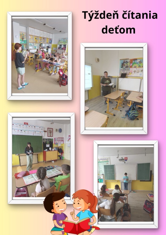 Čítanie v našej škole prebiehalo od 10.6.-14.6. 2024. Žiaci 5. až 9. ročníka Matúš Gajdoš, Martina Paulová, Michal Ujčík, Laura Hubočániová a Patrik Imre každý deň čítali svojim malým kamarátom ukážky z obľúbených rozprávkových kníh, kládli im otázky a spolu sa rozprávali o prečítaných príbehoch. Deťom sa aktivita veľmi páčila a netrpezlivo čakali, kedy im veľkí spolužiaci prídu opäť niečo zaujímavé prečítať. Pre všetkých to boli obohacujúce a príjemne prežité chvíle v spoločnosti kníh, plné zaujímavých a tajuplných príbehov.