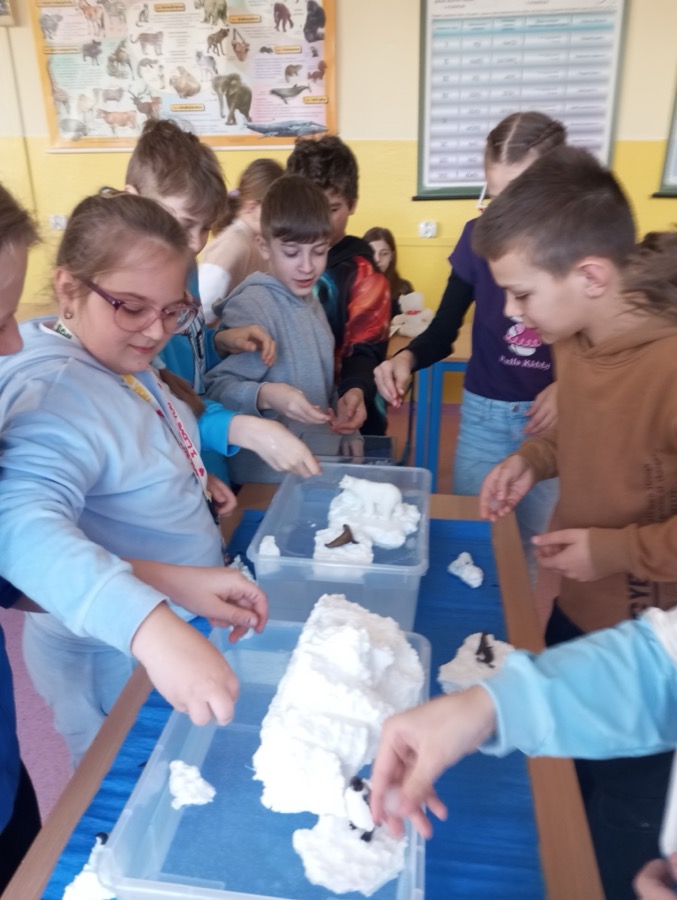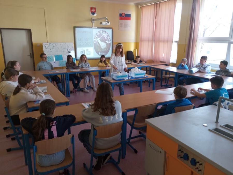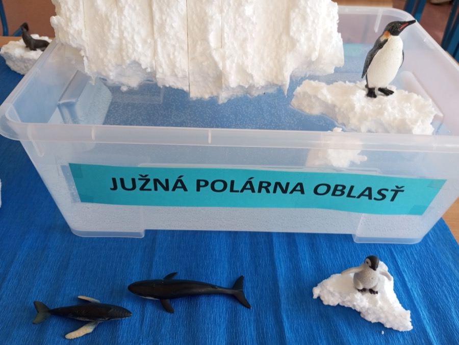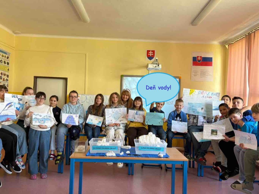 Každoročne si preto na našej škole pripomíname DEŇ VODY. Pripravujeme žiakom aktivity, ktoré zdôrazňujú potrebu ochrany vody. Žiaci I. stupňa sa tento rok zúčastnili osláv Dňa vody, ktoré sa uskutočnili na Námestí A. Hlinku v meste. Západoslovenská vodárenská spoločnosť pripravila pre deti pestrý program, rôzne súťaže zábavné a vedomostné. Žiaci sa teda nielen zabavili, ale odniesli si aj nové poznatky. Aktivity pre žiakov II. stupňa pripravili vyučujúci v škole. Hneď prvý pohľad na našich žiakov ukázal, že máme Deň vody. Prišli totiž oblečení v modrej, prípadne bielej farbe – súvislosť s témou ľadovcov. Na hodinách anglického jazyka žiaci tvorili krátke anglické básničky, naučili sa detskú anglickú pieseň „Jack and Jill“, zabavili sa s balónovým dažďom. Starší žiaci sa zapojili do kvízu vo vzdelávacej platforme Kahoot, vytvárali myšlienkové pojmové mapy pomocou objektu Word Art, hľadali spôsob ako šetriť vodou v angličtine, učili sa idiómy spojené s vodou. Na matematike počítali úlohy v spojitosti s vodou, na slovenskom jazyku dopĺňali text o vode…aktivít bolo aj na iných hodinách naozaj veľa. Pre piatakov sme pripravili interaktívnu hodinu na hodine biológie. V učebni biochémie ich čakali ľadovce – a to nielen vyrobené, ale aj skutočné ☺ a na nich zvieratká žijúce v polárnych oblastiach. Práve aktivita s ľadom bola tá najzábavnejšia. Okrem toho sa prostredníctvom prezentácie dozvedeli nové veci o ľadovcoch. Vedeli ste, že najväčší a najstarší ľadovec sa volá A23a ? Túto informáciu a tiež reálne fotky časovo práve z marca 2025 nám poslala p. Ivana Kulkarni, ktorá je Master mariner – Staff Captain on Cruise ship, jediná žena zo Slovenska ako kapitánka námorných lodí. Ivanka poslala deťom množstvo fotiek z polárnych oblastí s ľadovcami, o ktorých sme si hovorili, a ktoré počas plavby v Antarktíde nafotila. Tiež nám poslala fotky lode, na ktorej pracuje, za čo jej veľmi pekne ďakujem. A že naši žiaci sú šikovní, dokázali krásne projekty s ľadovcom a zvieratkami ako kosatka, tučniak, veľryba, ľadový medveď… Za odmenu dostali deti obrázky na kreslenie a sladkosť s témou vody. Na konci hodiny sme sa pozreli, že ľad, ktorý sme vhodili do vody sa naozaj roztopil. Žiaci si aj tu uvedomili, že topenie ľadovcov sa deje nielen v triede, ale bohužiaľ aj na našej Zemi.