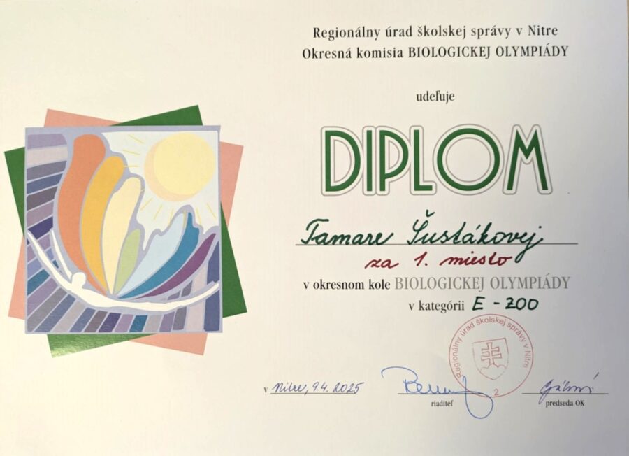 Tamara Šustáková, žiačka 7.a triedy, sa 9. apríla 2025 zúčastnila okresného kola biologickej olympiády, kde dosiahla vynikajúci výsledok – 1. miesto.