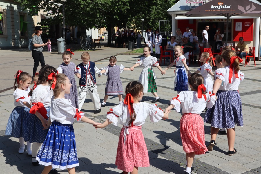 Ako prví sa predstavili malí folkloristi z Detského folklórneho súboru Zlatňanka. Po nich vystúpili hudobníci a tanečníci z folklórneho súboru Inovec. Počas ich vystúpenia sa deti zo Zlatňanky pustili do vyzdobovania mája pestrými stužkami.