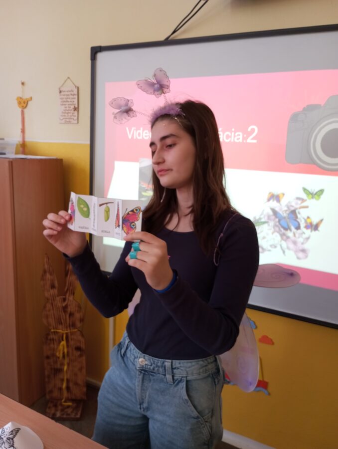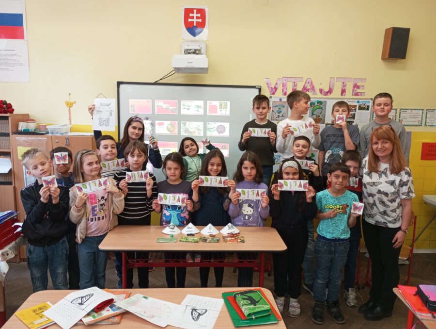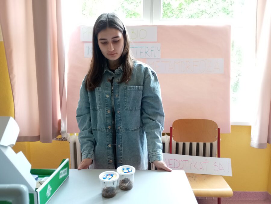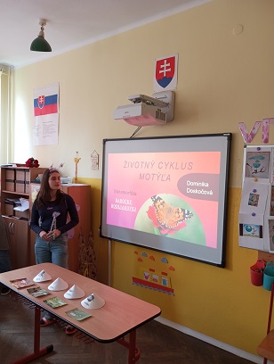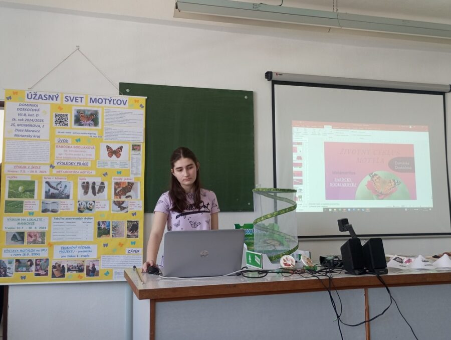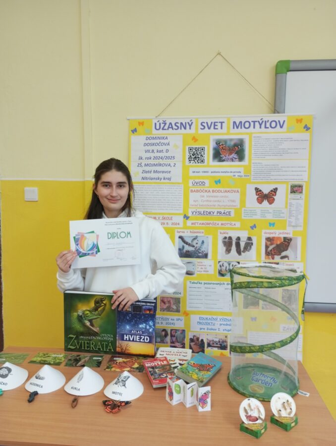 „Úžasný svet motýľov“ – to bol názov projektu žiačky Dominiky Doskočovej. Pracovať na svojom projekte začala už minulý školský rok, kedy sme do školy zakúpili od firmy PLAYLAB malé húsenice druhu babôčka bodliaková (lat. Vanessa cardui, syn.: Cynthia cardui, L., 1758). Ide o krásneho zástupcu čeľade babôčkovité (Nymphalidae). V časovom rozpätí od 7.mája do 29.mája 2024 Dominika pozorovala metamorfózu babôčky cez jej vývojové štádiá. Spolu so svojimi spolužiakmi sledovala ako sa mení húsenica na kuklu a tá na dospelého jedinca. Motýle babôčky Dominika prikrmovala sladkým nektárom, ktorý si cuciakom nasávali z pomarančov a kvetiniek v sieťke. Dňa 29. mája sme  nakoniec vypustili do voľnej prírody v areáli školy 10 jedincov babôčky bodliakovej. Dominika na projekte pracovala aj počas prázdnin, kedy sledovala druhové zastúpenie motýľov vo svojej obci a ich biotopové rozšírenie. Taktiež dala svojmu projektu aj edukačný význam  – urobila krásnu prednášku o motýľoch žiakom 1.stupňa. Okrem prezentácie im pripravila zábavnú úlohu a tiež pomôcku na učenie sa vývojových štádií motýľov. V spolupráci s SPU v Nitre sa zúčastnila prednášky a výstavy motýľov študenta SPU Jozefa Adameka, kde sa dozvedela ďalšie informácie o motýľoch. Vďaka p.Adamekovi sa obohatila naša školská zbierka o kukly exotických druhov motýľov. Dominika za svoj krásny vyše ročný projekt a za svoju až vedeckú prácu získala 1. miesto.