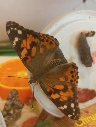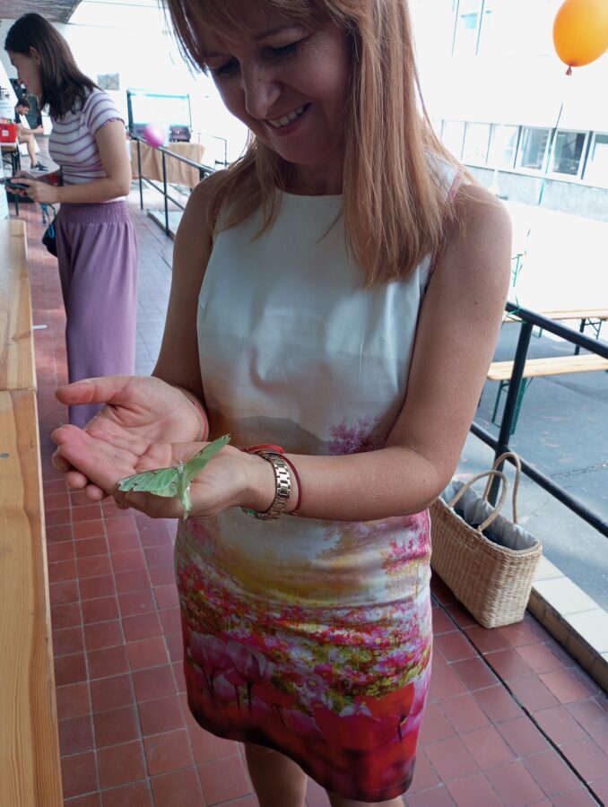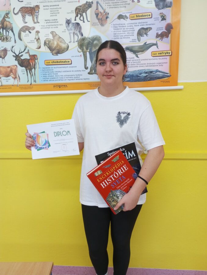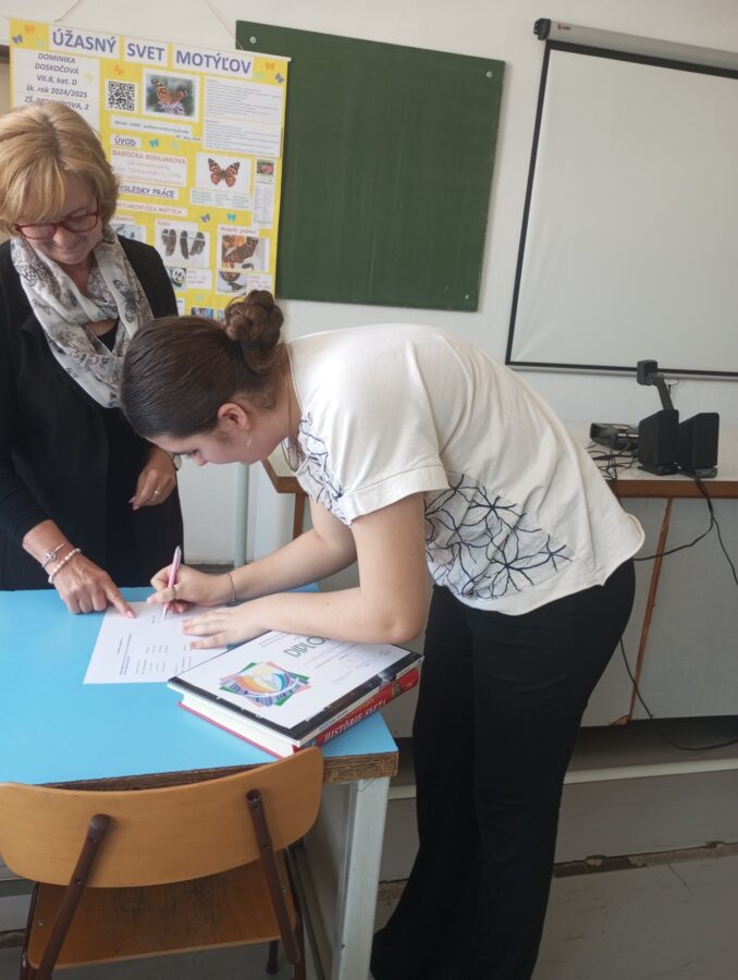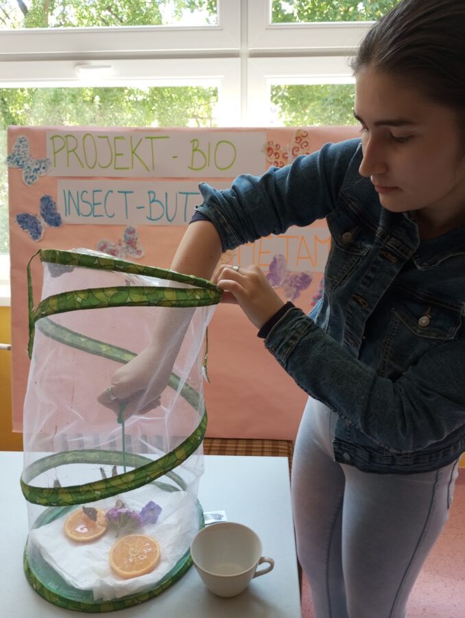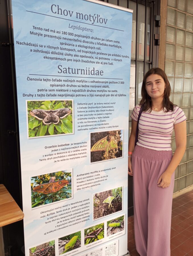 „Úžasný svet motýľov“ – to bol názov projektu žiačky Dominiky Doskočovej. Pracovať na svojom projekte začala už minulý školský rok, kedy sme do školy zakúpili od firmy PLAYLAB malé húsenice druhu babôčka bodliaková (lat. Vanessa cardui, syn.: Cynthia cardui, L., 1758). Ide o krásneho zástupcu čeľade babôčkovité (Nymphalidae). V časovom rozpätí od 7.mája do 29.mája 2024 Dominika pozorovala metamorfózu babôčky cez jej vývojové štádiá. Spolu so svojimi spolužiakmi sledovala ako sa mení húsenica na kuklu a tá na dospelého jedinca. Motýle babôčky Dominika prikrmovala sladkým nektárom, ktorý si cuciakom nasávali z pomarančov a kvetiniek v sieťke. Dňa 29. mája sme  nakoniec vypustili do voľnej prírody v areáli školy 10 jedincov babôčky bodliakovej. Dominika na projekte pracovala aj počas prázdnin, kedy sledovala druhové zastúpenie motýľov vo svojej obci a ich biotopové rozšírenie. Taktiež dala svojmu projektu aj edukačný význam  – urobila krásnu prednášku o motýľoch žiakom 1.stupňa. Okrem prezentácie im pripravila zábavnú úlohu a tiež pomôcku na učenie sa vývojových štádií motýľov. V spolupráci s SPU v Nitre sa zúčastnila prednášky a výstavy motýľov študenta SPU Jozefa Adameka, kde sa dozvedela ďalšie informácie o motýľoch. Vďaka p.Adamekovi sa obohatila naša školská zbierka o kukly exotických druhov motýľov. Dominika za svoj krásny vyše ročný projekt a za svoju až vedeckú prácu získala 1. miesto.