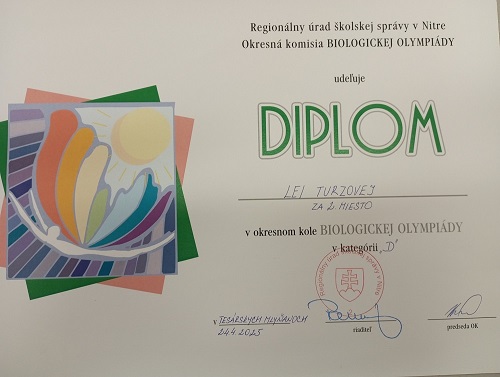 Naučiť sa na teoreticko – praktickú časť Biologickej olympiády vyžaduje taktiež množstvo času a úsilia. Žiak musí zvládnuť prácu s mikroskopom, s lupou, s biologickým materiálom a samozrejme mať potrebné vedomosti. Veľmi zodpovedne a usilovne pracovala aj naša žiačka Lea Turzová. Hodiny strávené nad učebnicami biológie a testami z Nivamu priniesli Lei krásne 2. miesto.