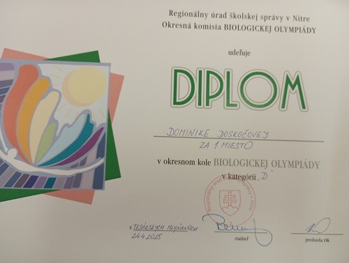 Obom našim šikovným dievčatám ďakujeme za krásnu reprezentáciu školy a samozrejme srdečne blahoželáme k úspechu. Sme radi, že biológia sa stala pre nich nielen predmetom v škole, ale aj záľubou. Dokazuje to aj záver v Dominikinej správe k projektu: „Biológia je pre mňa skutočne fascinujúca. Účasť na olympiáde mi dala motiváciu pokračovať v skúmaní prírody. Som hrdá na svoju prácu a verím, že môj výskum môže inšpirovať ďalších žiakov.“