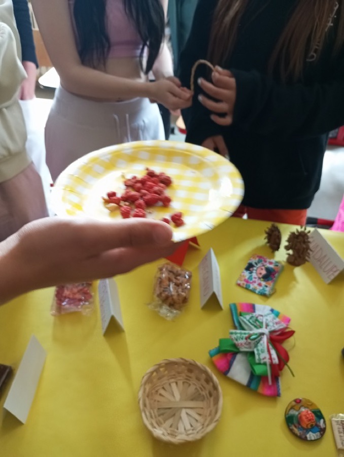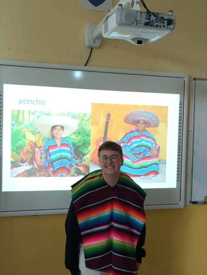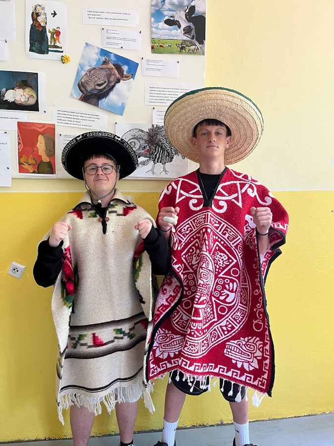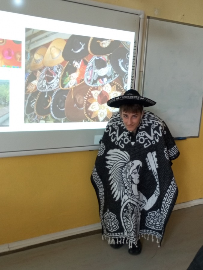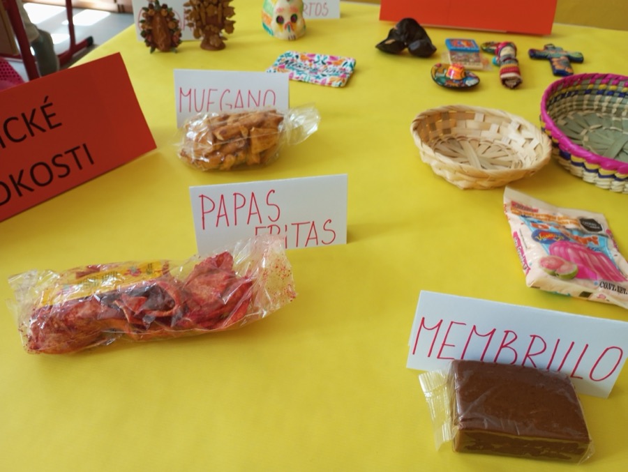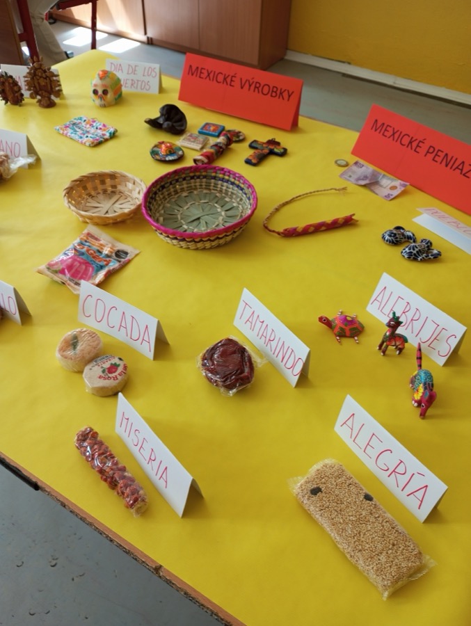 A práve takéto Mexiko spoznali naši deviataci na hodine Geografie. Základom interaktívnej hodiny, ktorú sme pre nich pripravili, bola samozrejme prezentácia s bohatým obsahom – sopky ako Popocatepetl, pyramídy v Teotihuacáne, tradičné poncho, sombréro, mexický „kroj“ a mexická hudba, farebné piňaty na oslavy, Frida Kahlo a ďalšie iné zaujímavosti. Slajd po slajde, fotku po fotke sme si prerozprávali čo všetko Mexiko ponúka. Pripomenuli sme si civilizácie Máyov a Aztékov, pútnické miesto Guadalupe, ktoré navštevujú aj mnohí Slováci. Spomenuli sme sviatok Dia De Los Muertos, pri ktorom si v Mexiku robia v domoch oltár s fotkou zosnulého a farebnými kvetmi. Z prírodných zaujímavostí zaujal žiakov axolotl mexický – endemit žijúci iba v jazerách Lago de Xochimilco a Lago de Chalco a nikde inde na svete. Dozvedeli sa tiež, že v štátnom znaku majú karanča stredoamerického sediaceho na kaktuse, čo je zasa typická rastlina Mexika. Mnohé informácie boli pre žiakov úplne nové. Čo ale poznali veľmi dobre, to boli typické gurmánske jedlá ako tacos, burritos, guacamole, chilli con carne zapísané do nehmotného dedičstva UNESCO. No, a aby hodina bola naozaj štipľavá, tak si žiaci priniesli rôzne „mexické pochúťky“ s pikantnými omáčkami a vďaka Nelke Frenkovej ochutnali aj doma pripravené churros. Najväčším gurmánskym zážitkom pre deti bola určite ochutnávka mexických sladkostí prinesených priamo z Mexika. Názvy ako cocada, tamarindo, miseria, alegria, membrillo počuli a jedli všetci prvýkrát. Niečo nám chutilo sladko, niečo naozaj poriadne štipľavo ☺ Okrem sladkostí si žiaci na hodine prezreli mexické tradičné výrobky, suveníry, peniaze, oblečenie a niektoré kúsky si aj vyskúšali. Mnohým to poncho a sombréro naozaj pristalo ☺