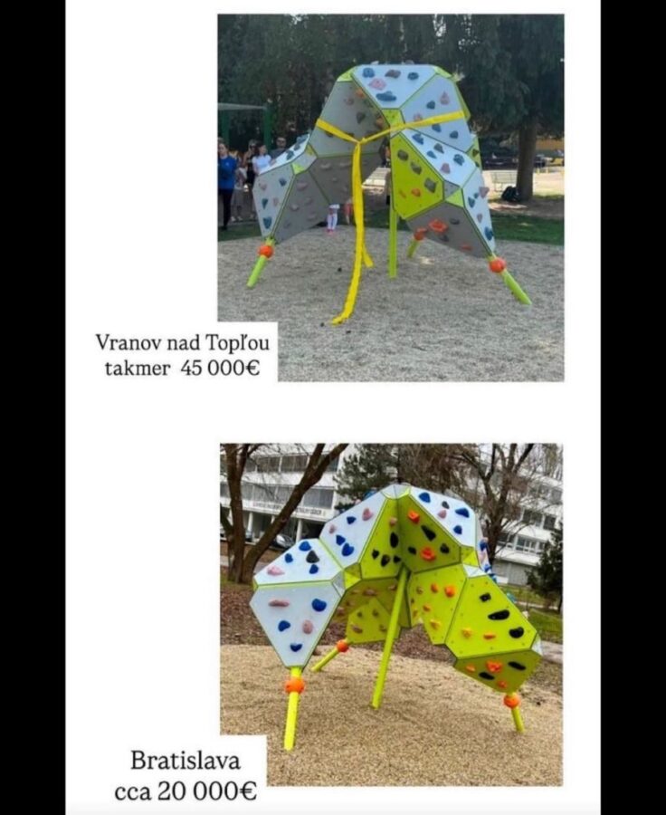 A skutočne. Zlaté Moravce za spomínanú lezeckú stenu zaplatili 8 200 eur, Bratislava približne 20 000 eur a Vranov nad Topľou takmer 45 000 eur. „Rozdiel medzi Zlatými Moravcami a Vranovom? Takmer 37 000 eur za rovnakú preliezačku. Prečo? To bude naša otázka na slovenské orgány,“ uviedol. „Naozaj potrebujeme na Slovensku dôslednú kontrolu verejných zákaziek a investícií. Toto nie je o deťoch, toto je o tom, ako niekto lezie daňovým poplatníkom po chrbte,“ dodal.
