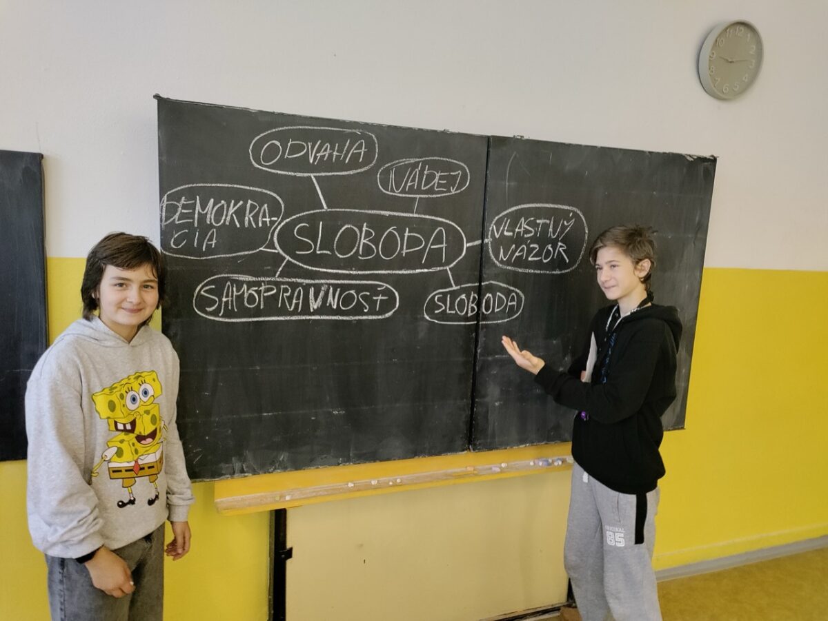 Žiaci 5.-6. ročníka si z pripravených kartičiek „vyskladali“ časovú os týkajúcu sa novembrových udalostí v roku 1939 a 1989, zamysleli sa nad významom slova sloboda, vypočuli si príbeh dieťaťa z roku 1989 a porovnávali ho s dneškom. Rozvíjali empatiu, kritické myslenie a schopnosť hľadať súvislosti.