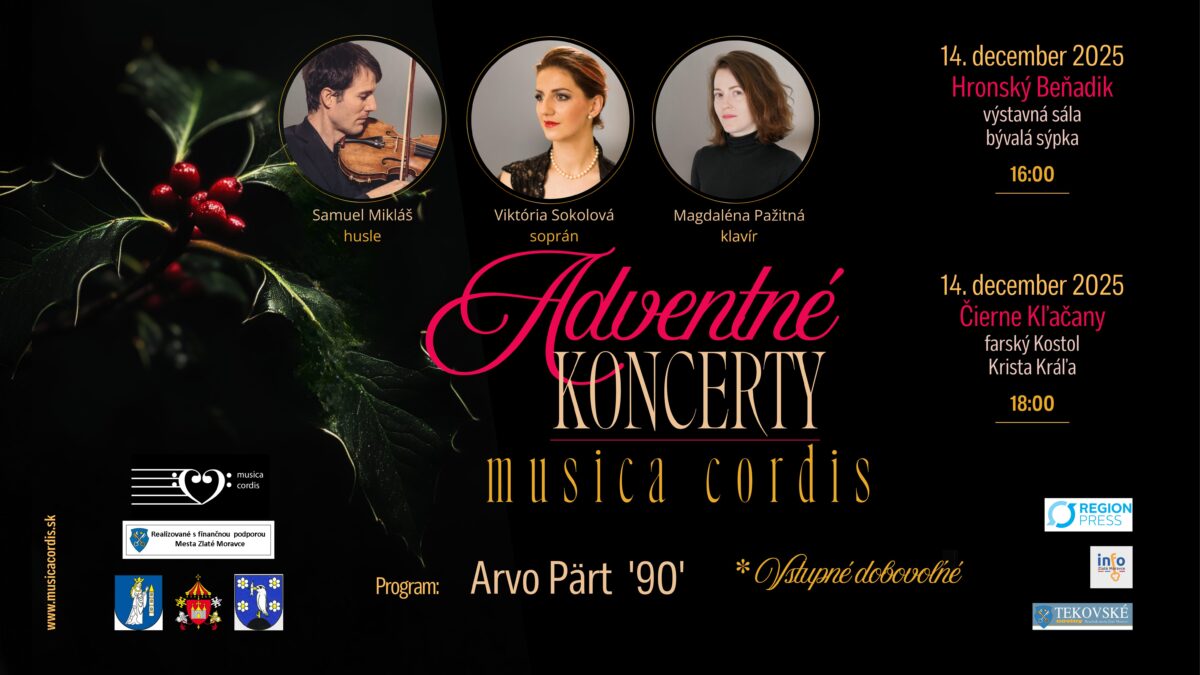 Domov Podujatia - Zlaté Moravce info Adventný koncert Arvo Pärt 90 Adventný koncert Arvo Pärt 90 + Pridať do Google kalendára + iCal / Outlook export 00 dní 00 hodín 00 minút 00 sekúnd Dátum 14 dec 2025 Čas 16:00 - 17:00 Viac info Čítať ďalej Štítky Koncert Miesto Výstavná sála (bývalá sýpka) Hronský Benadik Kategória Koncert Kultúra Organizátor Musica Cordis Telefón +421 911 949 963 Email musicacordiszm@gmail.com Web stránka http://www.musicacordis.sk Čítať ďalej Zdieľať udalosť