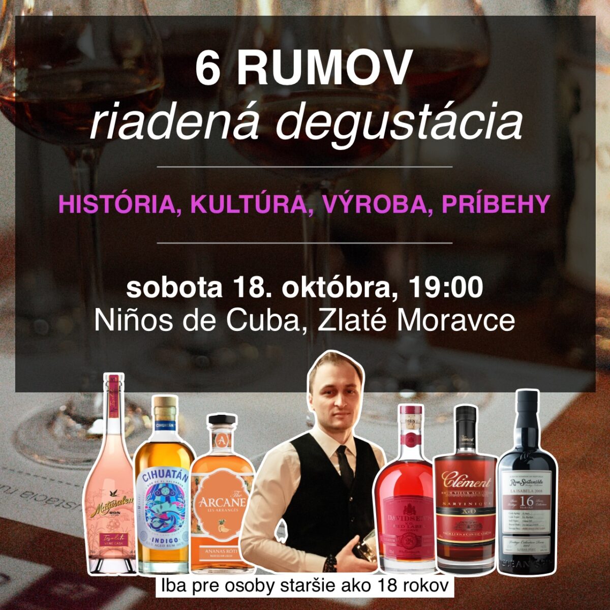 Zažite riadenú ochutnávku rumov v Zlatých Moravciach v sobotu 18.10. o 19:00 v Niños de Cuba. 6 prémiových rumov, história, kultúra, chute a vône.